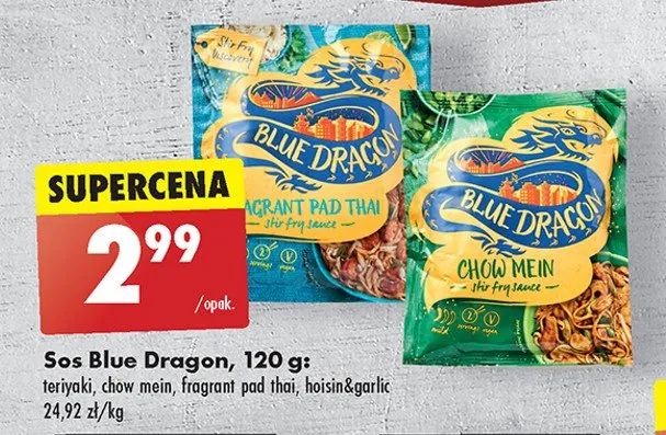 Cena produktu r贸偶ni si臋 w zale偶no艣ci od wybranego sklepu. Niestety nie posiadamy danych o aktualnych promocjach, jednak w艣r贸d archiwalnych ofert Sos hoisin & garlic Blue dragon kosztuje od 2,34 z艂 do 3,99 z艂.