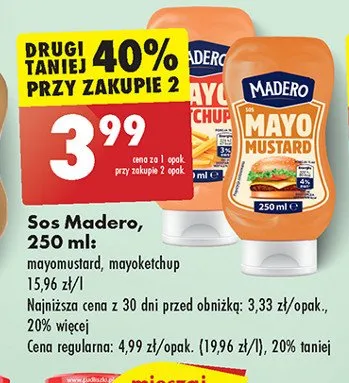 Cena produktu r贸偶ni si臋 w zale偶no艣ci od wybranego sklepu. Niestety nie posiadamy danych o aktualnych promocjach, jednak w艣r贸d archiwalnych ofert Sos mayo ketchup Madero kosztuje od 3,99 z艂 do 4,99 z艂.
