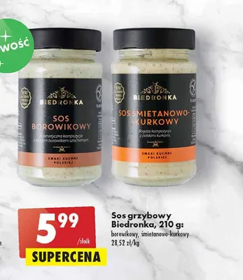 Cena produktu r贸偶ni si臋 w zale偶no艣ci od wybranego sklepu. Niestety nie posiadamy danych o aktualnych promocjach, jednak w艣r贸d archiwalnych ofert Sos 艣mietanowo-kurkowy Biedronka kosztuje od 5,99 z艂.