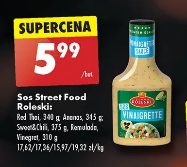 Cena produktu r贸偶ni si臋 w zale偶no艣ci od wybranego sklepu. Niestety nie posiadamy danych o aktualnych promocjach, jednak w艣r贸d archiwalnych ofert Sos sweet chili Roleski street food kosztuje od 4,99 z艂 do 5,99 z艂.