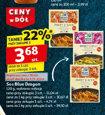 Cena produktu r贸偶ni si臋 w zale偶no艣ci od wybranego sklepu. Niestety nie posiadamy danych o aktualnych promocjach, jednak w艣r贸d archiwalnych ofert Sos sweet chilli Blue dragon kosztuje od 2,49 z艂 do 3,68 z艂.
