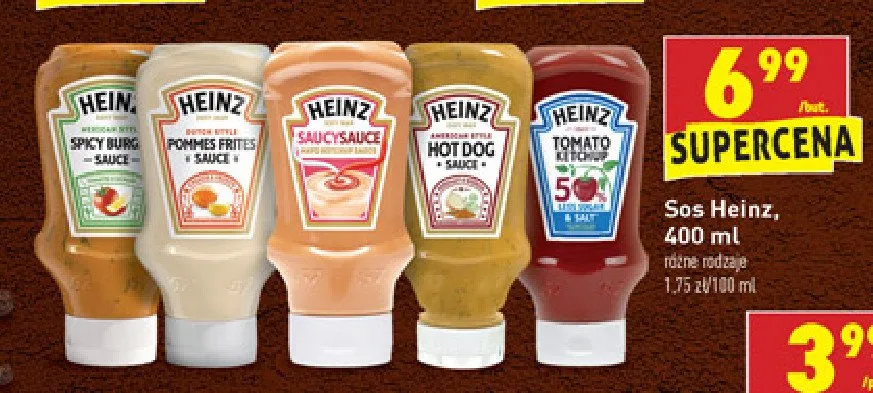Cena produktu r贸偶ni si臋 w zale偶no艣ci od wybranego sklepu. Niestety nie posiadamy danych o aktualnych promocjach, jednak w艣r贸d archiwalnych ofert Sos tangy burger sauce Heinz kosztuje od 6,99 z艂.