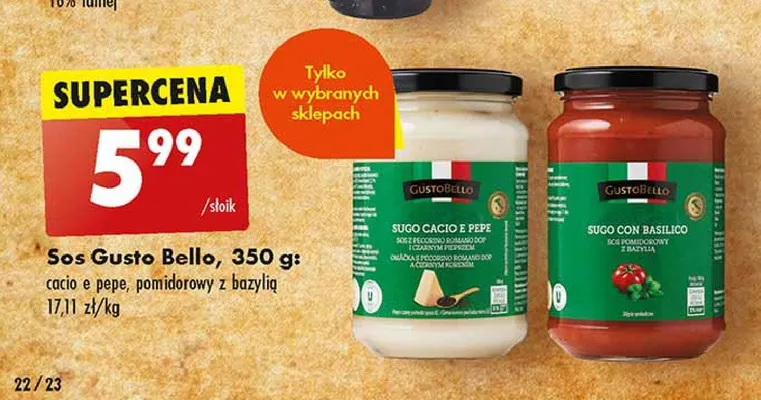 Zastanawiasz si臋, gdzie kupi膰 i ile kosztuje produkt Sos z pecorino romano i czarnym pieprzem Gustobello? Regularnie sprawdzamy, czy jest promocja na ten produkt w Biedronka, Lidl, Kaufland, Auchan, Netto, Makro i innych sklepach. Aktualnie nie posiadamy ofert promocyjnych na ten produkt.