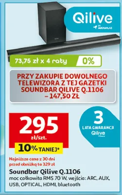 Cena produktu r贸偶ni si臋 w zale偶no艣ci od wybranego sklepu. Produkt Soundbar q.1106 Qilive mo偶esz kupi膰 w promocji ju偶 od 299 z艂. Najta艅sza oferta, jak膮 mamy w naszej bazie jest z sieci Auchan. Soundbar q.1106 Qilive kosztuje aktualnie 299 z艂. Zobacz ofert臋