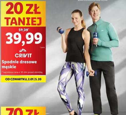 Cena produktu r贸偶ni si臋 w zale偶no艣ci od wybranego sklepu. Produkt Spodnie dresowe m臋skie Crivit mo偶esz kupi膰 w promocji ju偶 od 22,49 z艂. Najta艅sza oferta, jak膮 mamy w naszej bazie jest z sieci Lidl. Spodnie dresowe m臋skie Crivit kosztuje aktualnie 22,49 z艂. Zobacz ofert臋