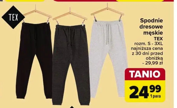 Zastanawiasz si臋, gdzie kupi膰 i ile kosztuje produkt Spodnie dresowe m臋skie Tex? Regularnie sprawdzamy, czy jest promocja na ten produkt w Biedronka, Lidl, Kaufland, Auchan, Netto, Makro i innych sklepach. Aktualnie posiadamy 4 oferty promocyjne na ten produkt. Ceny zaczynaj膮 si臋 od 27,99z艂!