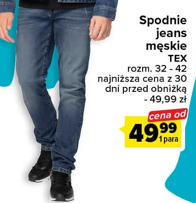 Cena produktu r贸偶ni si臋 w zale偶no艣ci od wybranego sklepu. Produkt Spodnie jeans m臋skie 32-42 Tex mo偶esz kupi膰 w promocji ju偶 od 45 z艂. Najta艅sza oferta, jak膮 mamy w naszej bazie jest z sieci Auchan. Spodnie jeans m臋skie 32-42 Tex kosztuje aktualnie 45 z艂. Zobacz ofert臋