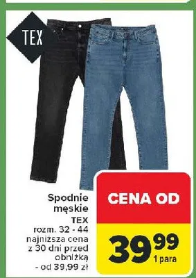 Cena produktu r贸偶ni si臋 w zale偶no艣ci od wybranego sklepu. Produkt Spodnie m臋skie 32-44 Tex mo偶esz kupi膰 w promocji ju偶 od 159 z艂. Najta艅sza oferta, jak膮 mamy w naszej bazie jest z sieci Selgros. Spodnie m臋skie 32-44 Tex kosztuje aktualnie 159 z艂. Zobacz ofert臋