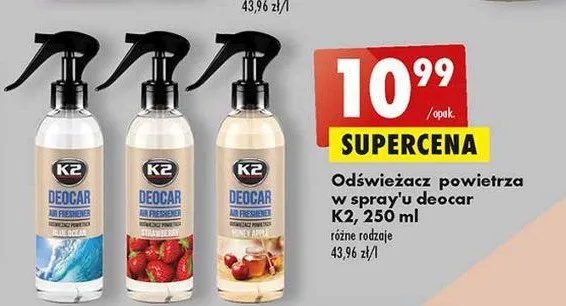 Cena produktu r贸偶ni si臋 w zale偶no艣ci od wybranego sklepu. Niestety nie posiadamy danych o aktualnych promocjach, jednak w艣r贸d archiwalnych ofert Spray do samochodu mi贸d jab艂ko kosztuje od 9,99 z艂 do 10,99 z艂.