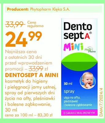 Ile kosztuje Spray na afty ple艣niawki i bolesne z膮bkowanie Dentosept a mini?