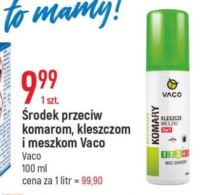 Cena produktu r贸偶ni si臋 w zale偶no艣ci od wybranego sklepu. Niestety nie posiadamy danych o aktualnych promocjach, jednak w艣r贸d archiwalnych ofert Spray na komary i kleszcze i meszki Vaco kosztuje od 9,49 z艂 do 11,99 z艂.
