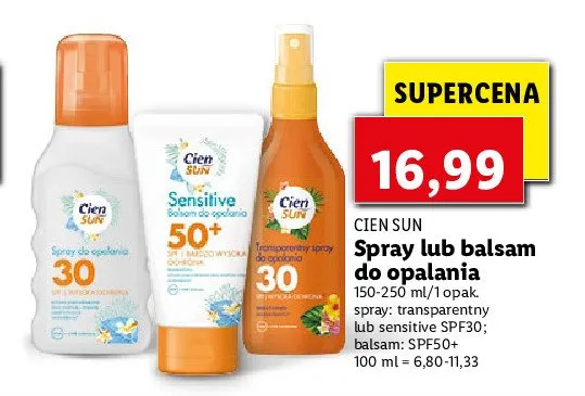 Cena produktu r贸偶ni si臋 w zale偶no艣ci od wybranego sklepu. Niestety nie posiadamy danych o aktualnych promocjach, jednak w艣r贸d archiwalnych ofert Spray transparentny 30 spf Cien sun kosztuje od 16,99 z艂.