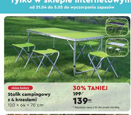 Cena produktu r贸偶ni si臋 w zale偶no艣ci od wybranego sklepu. Niestety nie posiadamy danych o aktualnych promocjach, jednak w艣r贸d archiwalnych ofert Stolik campingowy 120 x 64 x 70 cm + 4 krzes艂a kosztuje od 139 z艂.