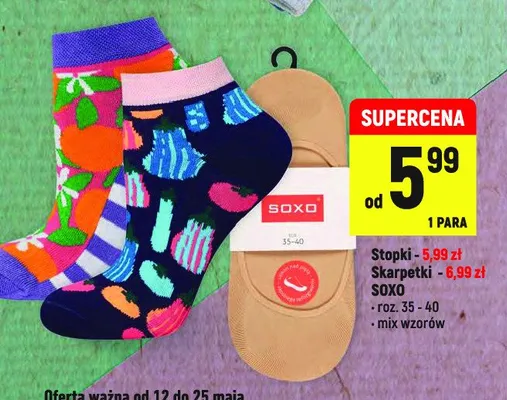 Cena produktu r贸偶ni si臋 w zale偶no艣ci od wybranego sklepu. Niestety nie posiadamy danych o aktualnych promocjach, jednak w艣r贸d archiwalnych ofert Stopki damskie 35-40 cm Soxo kosztuje od 5,99 z艂.