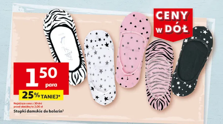 Zastanawiasz si臋, gdzie kupi膰 i ile kosztuje produkt Stopki damskie do balerin? Regularnie sprawdzamy, czy jest promocja na ten produkt w Biedronka, Lidl, Kaufland, Auchan, Netto, Makro i innych sklepach. Aktualnie nie posiadamy ofert promocyjnych na ten produkt.