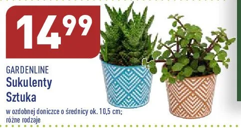 Cena produktu r贸偶ni si臋 w zale偶no艣ci od wybranego sklepu. Niestety nie posiadamy danych o aktualnych promocjach, jednak w艣r贸d archiwalnych ofert Sukulenty 10.5 cm GARDEN LINE kosztuje od 14,99 z艂.
