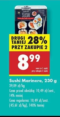 Cena produktu r贸偶ni si臋 w zale偶no艣ci od wybranego sklepu. Niestety nie posiadamy danych o aktualnych promocjach, jednak w艣r贸d archiwalnych ofert Sushi Marinero kosztuje od 7,99 z艂 do 10,49 z艂.