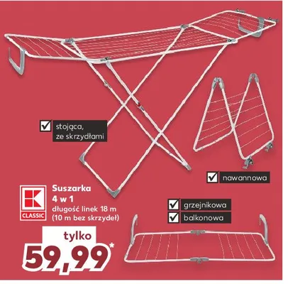 Cena produktu r贸偶ni si臋 w zale偶no艣ci od wybranego sklepu. Niestety nie posiadamy danych o aktualnych promocjach, jednak w艣r贸d archiwalnych ofert Suszarka 4w1 18 m K-classic kosztuje od 59,99 z艂.