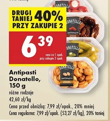 Cena produktu r贸偶ni si臋 w zale偶no艣ci od wybranego sklepu. Niestety nie posiadamy danych o aktualnych promocjach, jednak w艣r贸d archiwalnych ofert Suszone pomidory z serkiem Donatello antipasti kosztuje od 6,39 z艂 do 6,49 z艂.