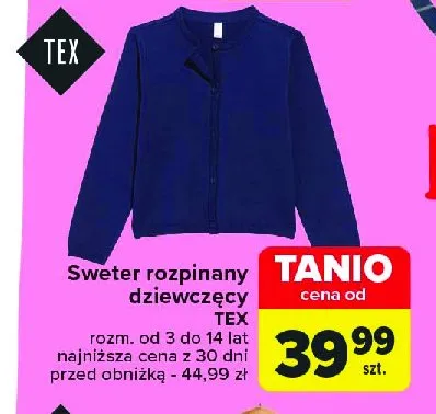 Cena produktu r贸偶ni si臋 w zale偶no艣ci od wybranego sklepu. Niestety nie posiadamy danych o aktualnych promocjach, jednak w艣r贸d archiwalnych ofert Sweter dziewcz臋cy rozpinany Tex kosztuje od 39,99 z艂.