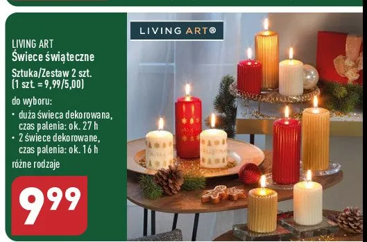Cena produktu r贸偶ni si臋 w zale偶no艣ci od wybranego sklepu. Niestety nie posiadamy danych o aktualnych promocjach, jednak w艣r贸d archiwalnych ofert 艢wieca dekoracyjna Living art kosztuje od 8,99 z艂 do 12,99 z艂.