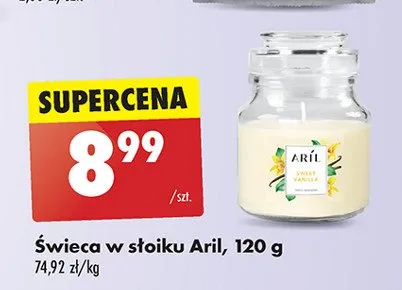 Cena produktu r贸偶ni si臋 w zale偶no艣ci od wybranego sklepu. Niestety nie posiadamy danych o aktualnych promocjach, jednak w艣r贸d archiwalnych ofert 艢wieca s艂odka wanilia Aril kosztuje od 8,99 z艂.
