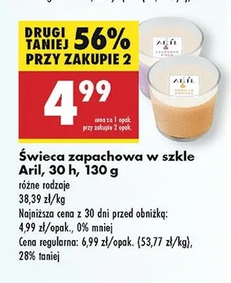 Cena produktu r贸偶ni si臋 w zale偶no艣ci od wybranego sklepu. Niestety nie posiadamy danych o aktualnych promocjach, jednak w艣r贸d archiwalnych ofert 艢wieca wanilia Aril kosztuje od 4,99 z艂 do 5 z艂.