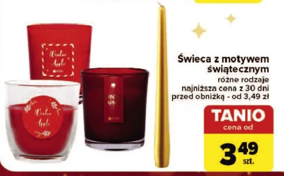 Cena produktu r贸偶ni si臋 w zale偶no艣ci od wybranego sklepu. Niestety nie posiadamy danych o aktualnych promocjach, jednak w艣r贸d archiwalnych ofert 艢wieca z motywem 艣wi膮tecznym kosztuje od 3,49 z艂.