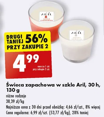 Cena produktu r贸偶ni si臋 w zale偶no艣ci od wybranego sklepu. Niestety nie posiadamy danych o aktualnych promocjach, jednak w艣r贸d archiwalnych ofert 艢wieca zapachowa jab艂ko-cynamon 30h Aril kosztuje od 3,49 z艂 do 4,99 z艂.