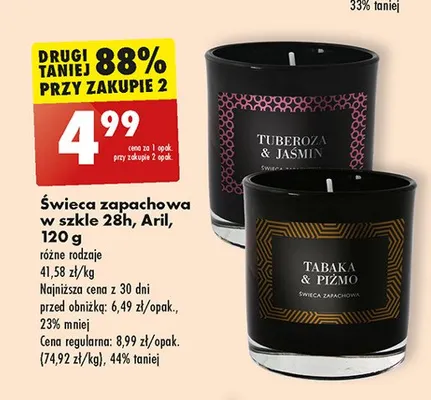 Cena produktu różni się w zależności od wybranego sklepu. Niestety nie posiadamy danych o aktualnych promocjach, jednak wśród archiwalnych ofert Świeca zapachowa tabaka & piżmo Aril kosztuje od 4,99 zł do 6,99 zł.