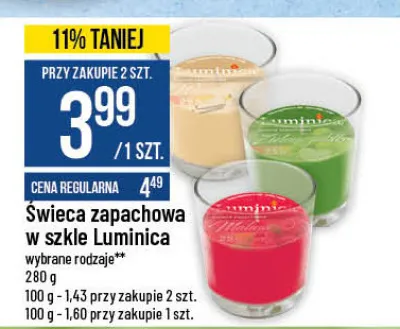 Cena produktu r贸偶ni si臋 w zale偶no艣ci od wybranego sklepu. Niestety nie posiadamy danych o aktualnych promocjach, jednak w艣r贸d archiwalnych ofert 艢wieca zapachowa truskawka Luminica kosztuje od 3,99 z艂.