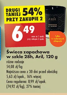 Cena produktu r贸偶ni si臋 w zale偶no艣ci od wybranego sklepu. Niestety nie posiadamy danych o aktualnych promocjach, jednak w艣r贸d archiwalnych ofert 艢wieca zapachowa tuberoza & ja艣min Aril kosztuje od 6,49 z艂 do 6,99 z艂.