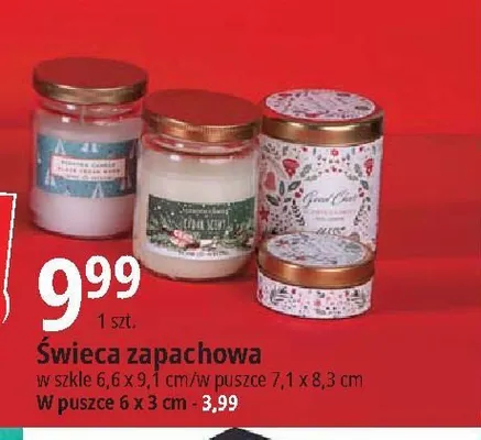 Cena produktu r贸偶ni si臋 w zale偶no艣ci od wybranego sklepu. Niestety nie posiadamy danych o aktualnych promocjach, jednak w艣r贸d archiwalnych ofert 艢wieca zapachowa w puszce 6 x 3 cm kosztuje od 9,99 z艂.