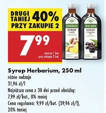 Cena produktu r贸偶ni si臋 w zale偶no艣ci od wybranego sklepu. Niestety nie posiadamy danych o aktualnych promocjach, jednak w艣r贸d archiwalnych ofert Syrop z imbiru Herbarium kosztuje od 7,99 z艂.