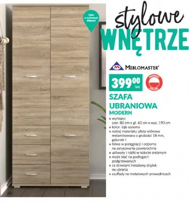 Szafa ubraniowa 80 x 60 x 190 cm Meblomaster aktualnie nie wyst臋puje w bazie naszych gazetek promocyjnych. Nie martw si臋! Gdy tylko pojawi si臋 ciekawa promocja na Szafa ubraniowa 80 x 60 x 190 cm Meblomaster, umie艣cimy j膮 na naszej stronie