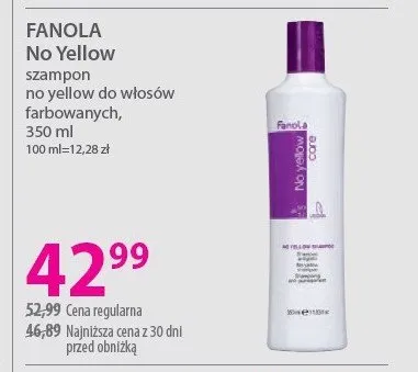 Cena produktu różni się w zależności od wybranego sklepu. Niestety nie posiadamy danych o aktualnych promocjach, jednak wśród archiwalnych ofert Szampon do włosów neutralizujący żółte refleksy FANOLA NO YELLOW kosztuje od 37,49 zł do 46,99 zł.
