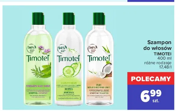Zastanawiasz si臋, gdzie kupi膰 i ile kosztuje produkt Szampon do w艂os贸w pure Timotei? Regularnie sprawdzamy, czy jest promocja na ten produkt w Biedronka, Lidl, Kaufland, Auchan, Netto, Makro i innych sklepach. Aktualnie posiadamy 24 oferty promocyjne na ten produkt. Ceny zaczynaj膮 si臋 od 13,99z艂!