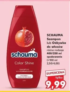 Cena produktu r贸偶ni si臋 w zale偶no艣ci od wybranego sklepu. Produkt Szampon do w艂os贸w Schauma color shine mo偶esz kupi膰 w promocji ju偶 od 9,99 z艂 do 39,99 z艂. Najta艅sza oferta, jak膮 mamy w naszej bazie jest z sieci Carrefour Market. Szampon do w艂os贸w Schauma color shine kosztuje aktualnie 9,99 z艂. Zobacz ofert臋