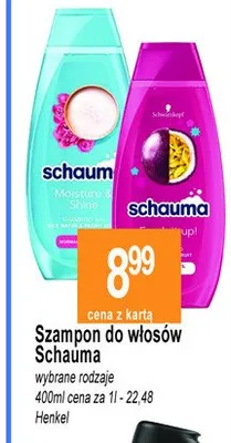 Cena produktu r贸偶ni si臋 w zale偶no艣ci od wybranego sklepu. Produkt Szampon do w艂os贸w Schauma moisture & shine mo偶esz kupi膰 w promocji ju偶 od 7,99 z艂 do 25,49 z艂. Najta艅sza oferta, jak膮 mamy w naszej bazie jest z sieci Intermarche. Szampon do w艂os贸w Schauma moisture & shine kosztuje aktualnie 7,99 z艂. Zobacz ofert臋