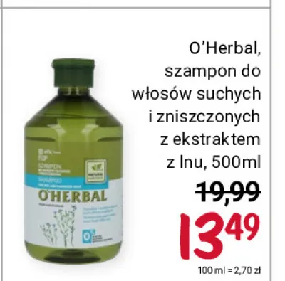 Cena produktu r贸偶ni si臋 w zale偶no艣ci od wybranego sklepu. Niestety nie posiadamy danych o aktualnych promocjach, jednak w艣r贸d archiwalnych ofert Szampon do w艂os贸w z ekstraktem z lnu O'herbal kosztuje od 13,49 z艂.