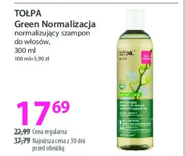 Cena produktu r贸偶ni si臋 w zale偶no艣ci od wybranego sklepu. Niestety nie posiadamy danych o aktualnych promocjach, jednak w艣r贸d archiwalnych ofert Szampon normalizuj膮cy To艂pa green kosztuje od 13,99 z艂 do 18,99 z艂.