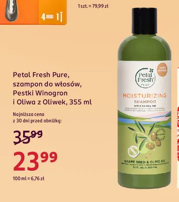 Cena produktu r贸偶ni si臋 w zale偶no艣ci od wybranego sklepu. Niestety nie posiadamy danych o aktualnych promocjach, jednak w艣r贸d archiwalnych ofert Szampon pestki winogron i oliwa z oliwek PETAL FRESH PURE kosztuje od 23,99 z艂.