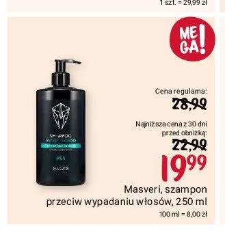 Cena produktu różni się w zależności od wybranego sklepu. Niestety nie posiadamy danych o aktualnych promocjach, jednak wśród archiwalnych ofert Szampon przeciwłupieżowy pielęgnujący skórę głowy Masveri kosztuje od 14,99 zł do 19,99 zł.