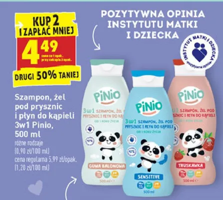 Cena produktu różni się w zależności od wybranego sklepu. Niestety nie posiadamy danych o aktualnych promocjach, jednak wśród archiwalnych ofert Szampon żel i płyn do kąpieli guma balonowa Pinio kosztuje od 4,39 zł do 4,99 zł.