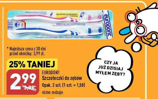Cena produktu r贸偶ni si臋 w zale偶no艣ci od wybranego sklepu. Niestety nie posiadamy danych o aktualnych promocjach, jednak w艣r贸d archiwalnych ofert Szczoteczka do z臋b贸w 艣rednia Eurodont kosztuje od 2 z艂 do 3 z艂.