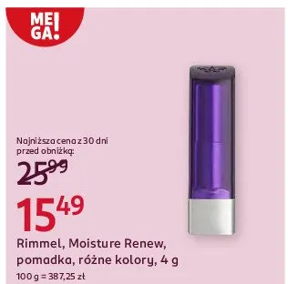 Cena produktu r贸偶ni si臋 w zale偶no艣ci od wybranego sklepu. Niestety nie posiadamy danych o aktualnych promocjach, jednak w艣r贸d archiwalnych ofert Szminka do ust Rimmel moisture renew kosztuje od 15,49 z艂.
