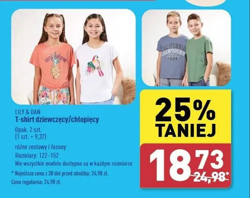 Cena produktu r贸偶ni si臋 w zale偶no艣ci od wybranego sklepu. Niestety nie posiadamy danych o aktualnych promocjach, jednak w艣r贸d archiwalnych ofert T-shirt dziewcz臋cy 122-152 Lily & dan kosztuje od 18,73 z艂 do 24,98 z艂.