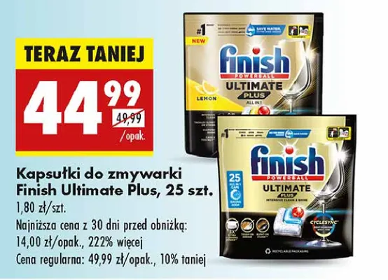 Cena produktu r贸偶ni si臋 w zale偶no艣ci od wybranego sklepu. Niestety nie posiadamy danych o aktualnych promocjach, jednak w艣r贸d archiwalnych ofert Tabletki do zmywarek Finish ultimate plus kosztuje od 25 z艂 do 44,99 z艂.