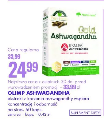Cena produktu r贸偶ni si臋 w zale偶no艣ci od wybranego sklepu. Niestety nie posiadamy danych o aktualnych promocjach, jednak w艣r贸d archiwalnych ofert Tabletki OLIMP GOLD ASHWAGANDHA kosztuje od 24,99 z艂.