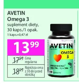 Cena produktu r贸偶ni si臋 w zale偶no艣ci od wybranego sklepu. Niestety nie posiadamy danych o aktualnych promocjach, jednak w艣r贸d archiwalnych ofert Tabletki omega 3 Avetin kosztuje od 13,99 z艂.